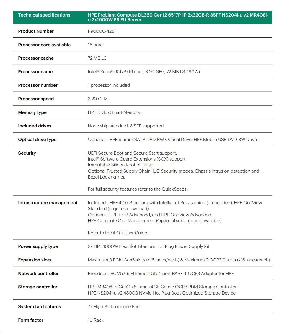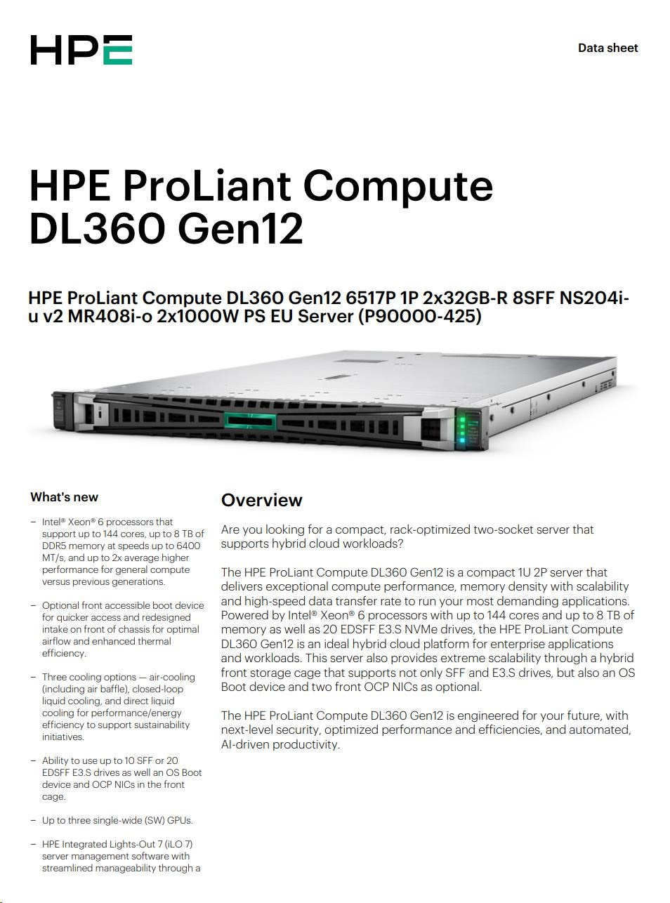 HPE PL DL360g12 6517P (3.2/16C) 2x32G (P69727) NS204 (2x480) MR408i-o 8SFF 2x1000W 4p1G NBD333 Smart Choice