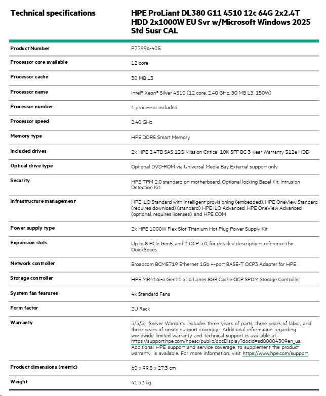 HPE PL DL380g11 4510 (2.4/12C) 2x32G (p64706) 2x2.4TB/10k MR416i-o/8G 2x1000W 8SFF 4x1G WS2025STD Smart Choice