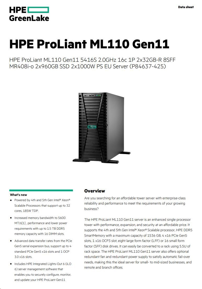 | Chassis | HPE ProLiant ML110 Gen11 SFF Configure-to-order Server |