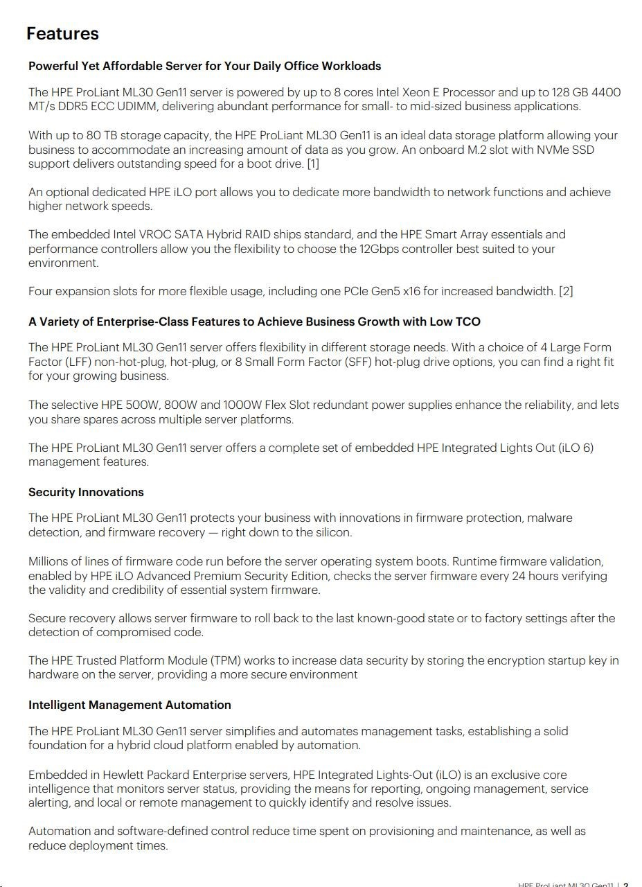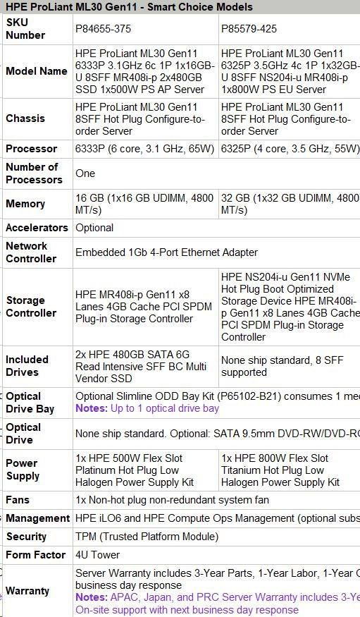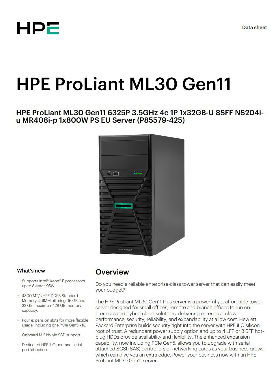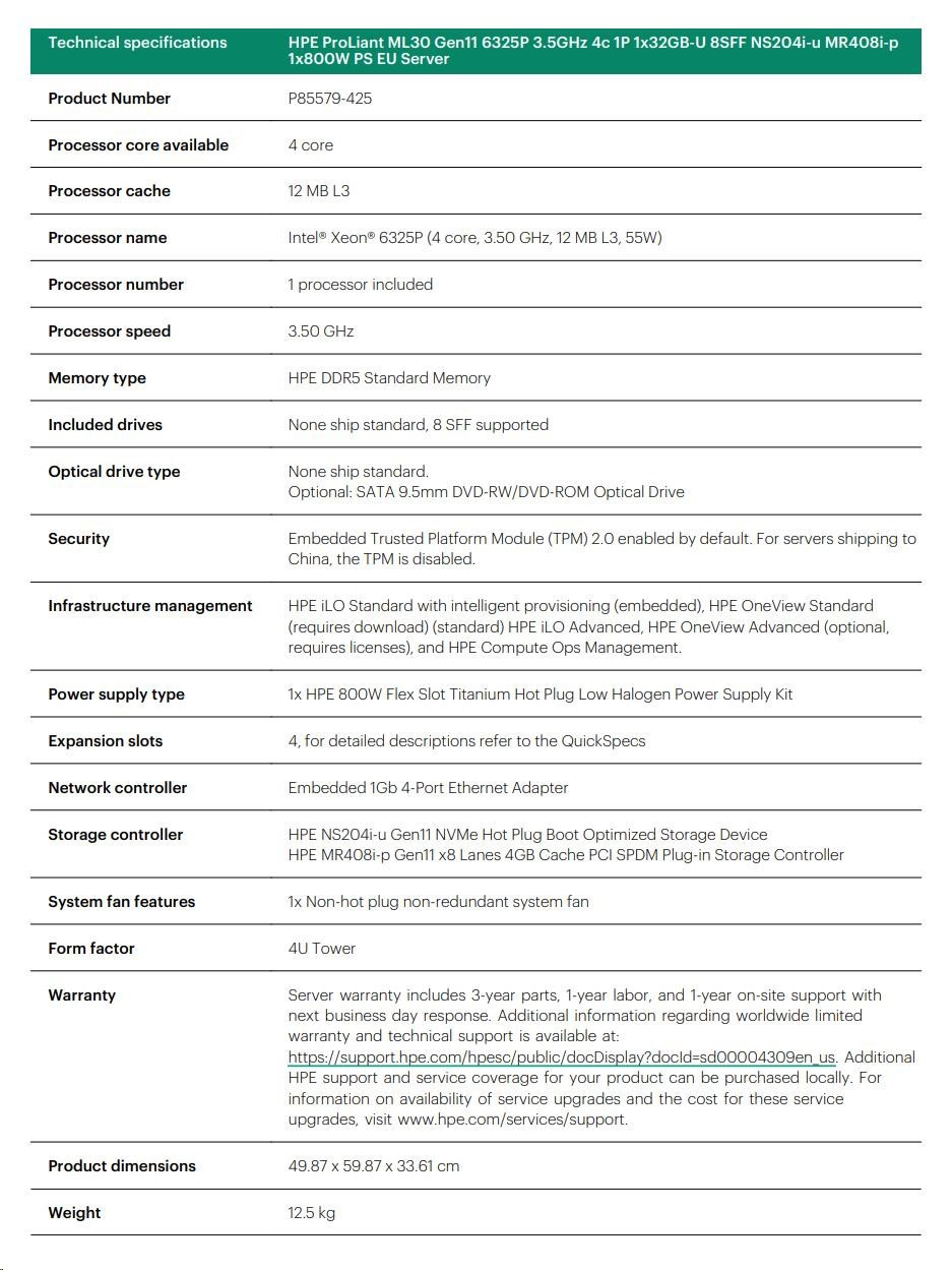 HPE PL ML30g11 6325P (3.5G/4C8T) 1x32G 8SFF NS204i-u(2x480g) MR408i-p/4G 2x800W 3/1/1 Smart Choice