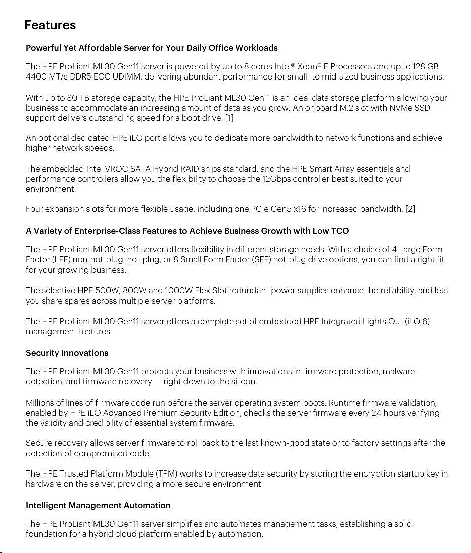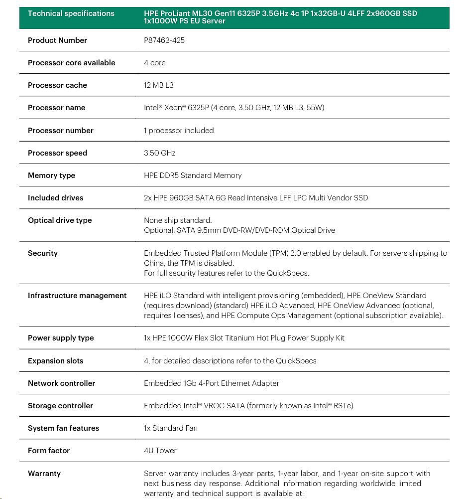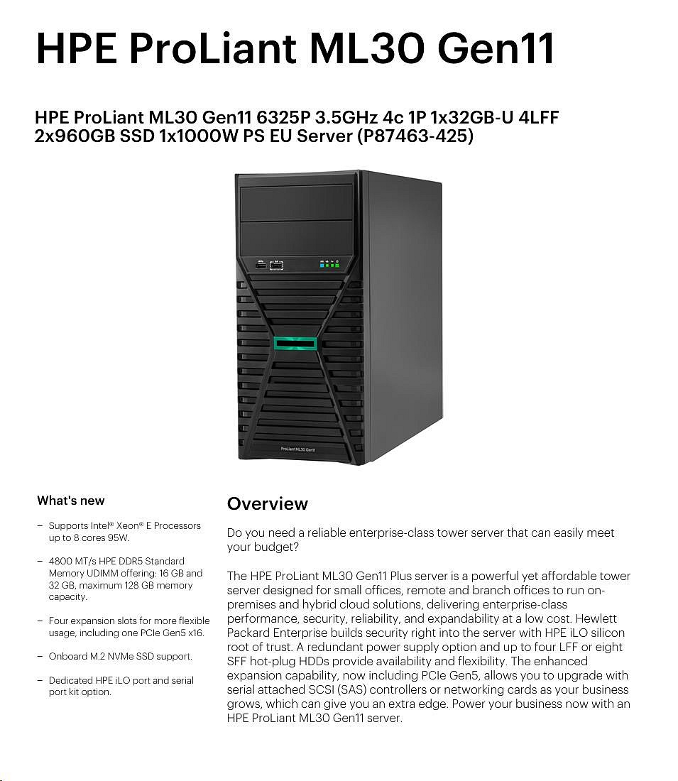 HPE PL ML30g11 6325P (3.5G/4C8T) 1x32G 2x960G SSD SATA 4LFF-HP VROC 1x1000W 4p1G NBD311 Smart Choice