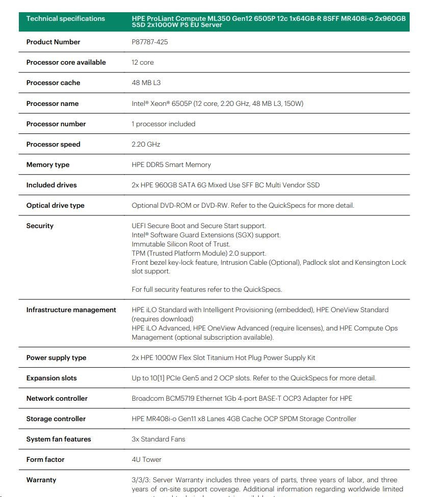 HPE PL ML350g12 6505P (2.2/12C) 1x32G (P69728) 2x4TB 4LFF MR408i-o2x1000W 1GbE NBD333 Smart Choice