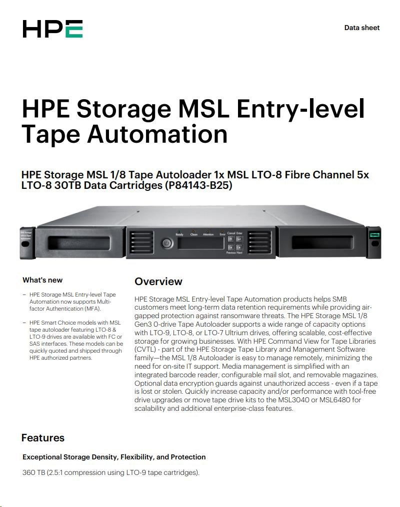 HPE Storage MSL 1/8 Tape Autoloader 1x MSL LTO-8 Fibre Channel 5x LTO-8 30TB Data Cartridges