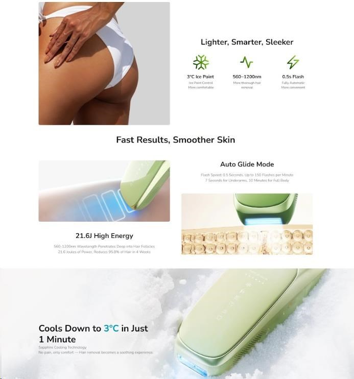 Predstavte si, že už za 4 týždne uvidíte viditeľnú redukciu chloupkov a vaša pokožka bude hodvábne hladká. Originálna chladivá technológia, ktorá udržiava teplotu hlavice na príjemných 10 °C, zabezpečuje úplne bezbolestné ošetrenie od začiatku do konca. To všetko je zabalené v unikátnom, kompaktnom a ľahkom dizajne (len 286 g), ktorý je inšpirovaný eleganciou starovekých svitkov a je dokonalým spoločníkom na cesty.