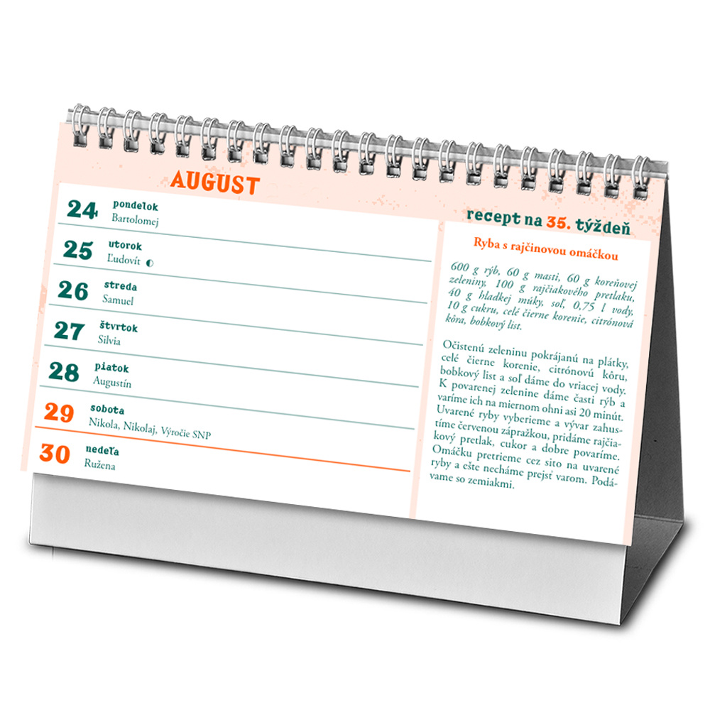 Stolový týždenný kalendár, s listami z 80g bezdrevého papiera, viazaný kovovou bielou špirálou. Rozmer: 188x106 mm.