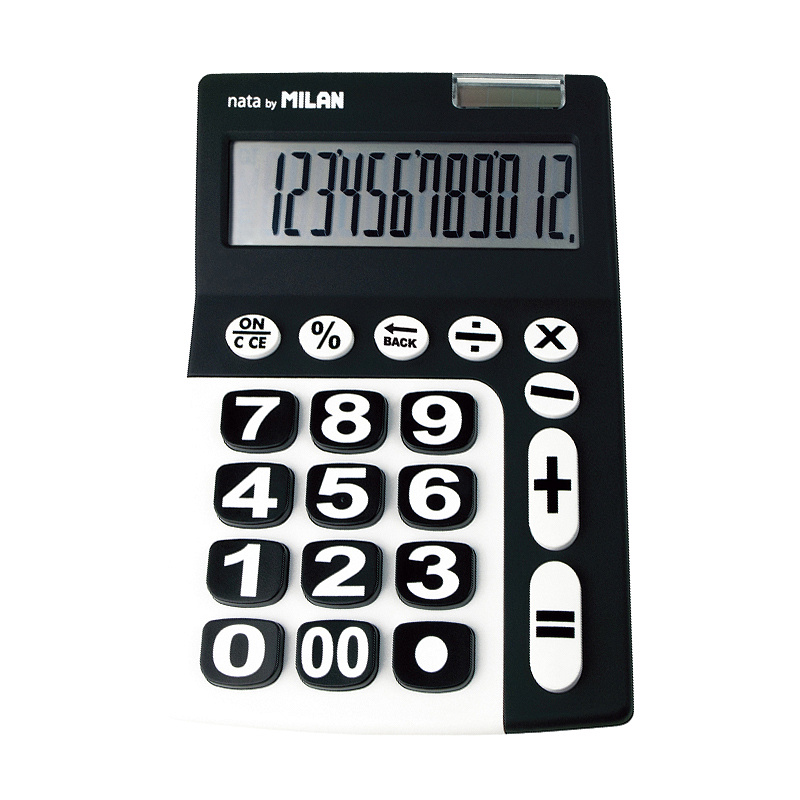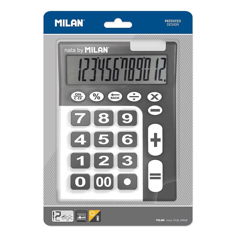 Stolová 12-miestna kalkulačka MILAN so zahnutým displejom. Kalkulačka s veľkými plastovými tlačidlami a číslami. Výhodou je duálne napájanie: 1,5 V batéria + solárny panel. Kalkulačka má základné funkcie, percentá %, opravné tlačidlo.