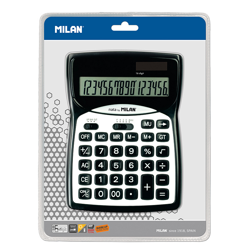 Stolová 16-miestna kalkulačka. Funkcie: výpočet marží, kumulatívna pamäť výsledkov operácií a druhá odmocnina. Dvojitý výkon: solárne články a 1,5 V batéria. Farba: čierna s bielym panelom.