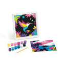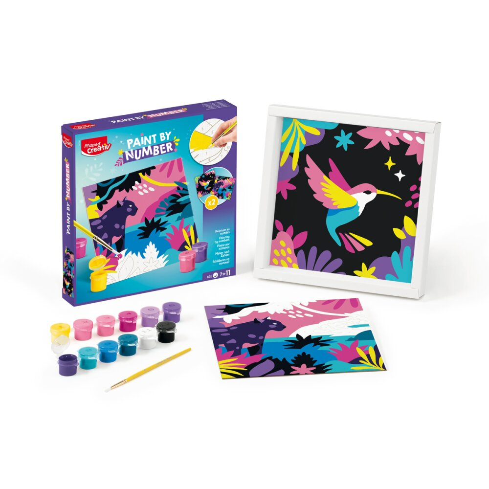 Kreatívna sada Maped Creativ Paint by number s motívmi leoparda a vtáka na vytváranie krásnych obrázkov pomocou techniky maľovania podľa čísel. Sada obsahuje 2 číslované šablóny na vyfarbenie , 12 fľaštičiek s akrylovými farbami, štetec a rámček na vystavenie obrázku.