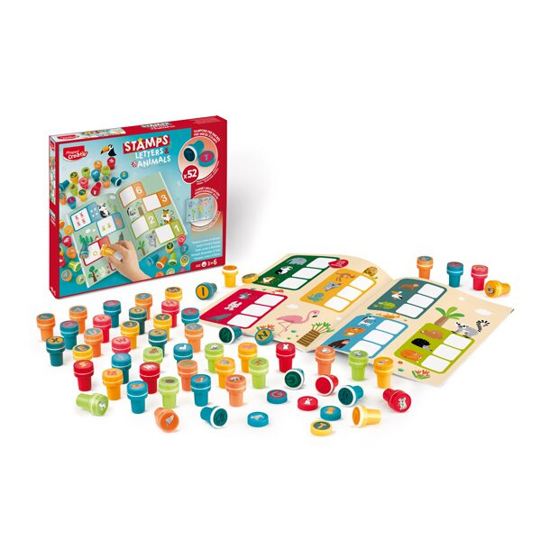 Kreatívna sada Maped Creativ Stamps Alphabet & Animals umožňuje zábavnú aktivitu, pri ktorej spoznáte abecedu a zvieratká z celého sveta. Sada obsahuje blok (20 strán) s ilustráciami zo sveta zvierat a 52 ks pečiatok s predtlačenými motívmi (26 ks s abecedou a 26 ks so zvieratkami). Umývateľný atrament. Jednoduché a čisté použitie.
