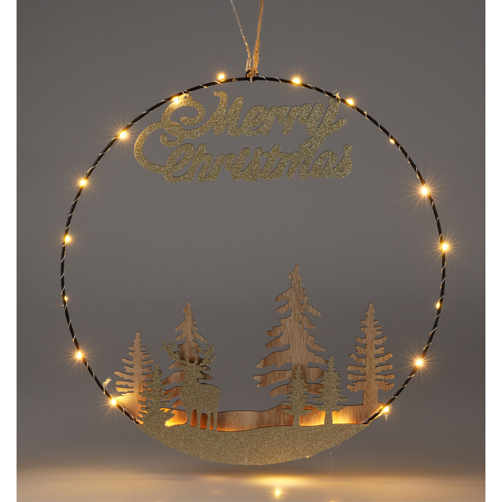 priemer: 40 cm 20x LED biela teplá dĺžka prívodného vodiča: 30 cm zlatý, trblietavý nápis Merry Christmas batérie: 2x AA 1,5V (nie sú súčasťou balenia) materiál: kov, topoľové drevo variantu vyberte v poli nad cenovkou