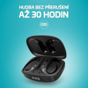 Slúchadlá hrajú na jedno nabitie až 12 hodín v kuse, s dobíjacím puzdrom vydržia až 30 hodín.