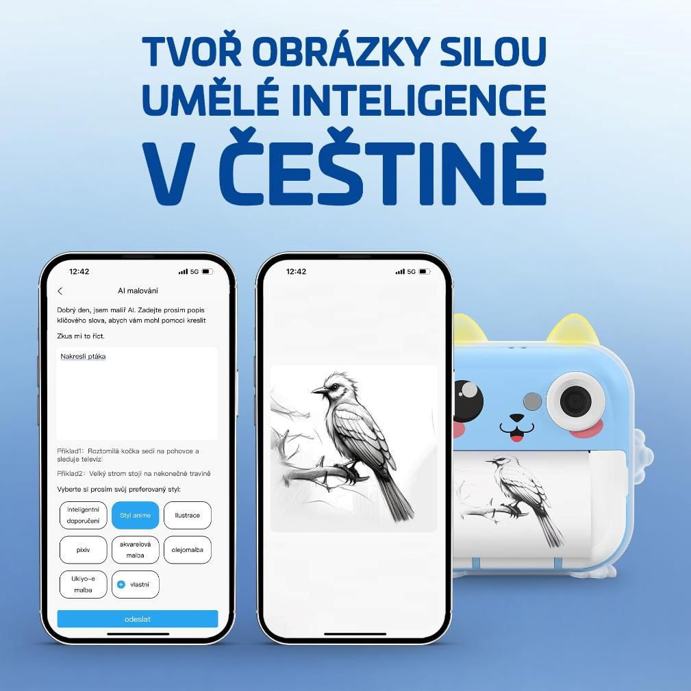 Foťák je prepojený s chytrou aplikáciou v češtine, takže jej ovládanie zvládnu aj menšie deti. Aplikácia toho ale vie oveľa viac. Okrem tlače fotiek, poznámok alebo samolepiek priamo z telefónu zvláda aj skenovanie ručne písaných zápiskov, preklady textov z obrázkov, AI vyfarbovanie, tvorbu obrázkov pomocou umelej inteligencie alebo prevod fotografií do animovaného štýlu. Stačí pár kliknutí a deti si samy vytvoria obrázky presne podľa svojej predstavy.