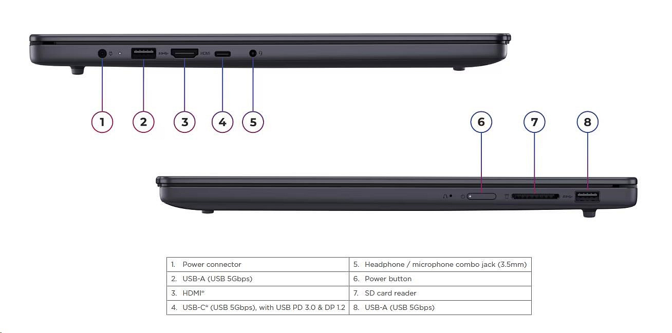 | Standartné porty | 2x USB-A (USB 5Gbps / USB 3.2 Gen 1) 1x USB-C® (USB 5Gbps / USB 3.2 Gen 1), with USB PD 45-65W and DisplayPort™ 1.2 1x HDMI® 1.4 1x Headphone / microphone combo jack (3.5mm) 1x SD card reader 1x Round tip power connector |