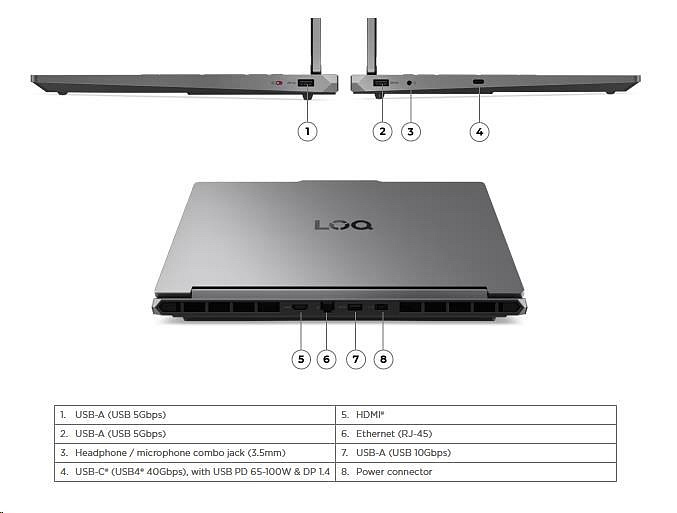 | Standartné porty | 2x USB-A (USB 5Gbps) 1x USB-A (USB 10Gbps) 1x USB-C® (USB4® 40Gbps), with USB PD 65-100W and DisplayPort™ 1.4 1x HDMI® 2.1, up to 8K/60Hz 1x Headphone / microphone combo jack (3.5mm) 1x Ethernet (RJ-45) 1x Slim tip Power connector |