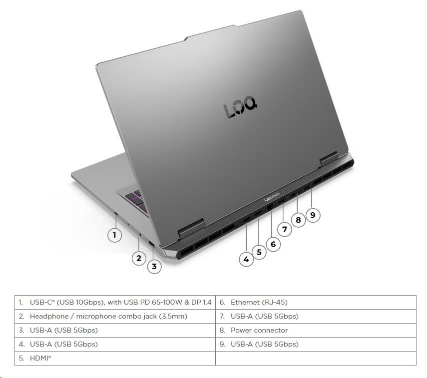 | Standartné porty | 4x USB-A (USB 5Gbps / USB 3.2 Gen 1) 1x USB-C® (USB 10Gbps / USB 3.2 Gen 2), with USB PD 65-100W and DisplayPort™ 1.4 1x HDMI® 2.1, up to 8K/60Hz 1x Headphone / microphone combo jack (3.5mm) 1x Ethernet (RJ-45) 1x Power connector |