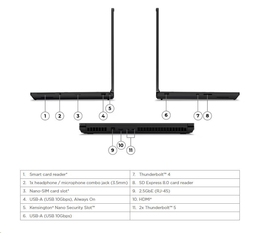 | Standartné porty | 1x USB-A (USB 10Gbps / USB 3.2 Gen 2), Always On 1x USB-A (USB 10Gbps / USB 3.2 Gen 2) 2x Thunderbolt™ 5, with DisplayPort™ 2.1 and USB PD 3.1, 180W input / 15W output 1x Thunderbolt™ 4, with DisplayPort™ 2.1 and USB PD 3.1, 180W input / 15W output 1x HDMI® 2.1, up to 8K/60Hz 1x Headphone / microphone combo jack (3.5mm) 1x Ethernet (2.5GbE RJ-45) 1x SD Express 8.0 card reader |