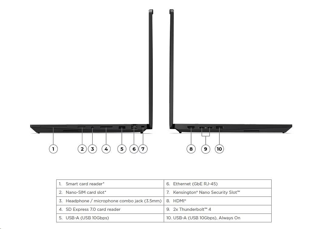| Standartné porty | 1x USB-A (USB 10Gbps / USB 3.2 Gen 2), Always On 1x USB-A (USB 10Gbps / USB 3.2 Gen 2) 2x Thunderbolt™ 4, with USB PD 3.1, 140W input / 15W output 1x HDMI® 2.1, up to 8K/60Hz 1x Headphone / microphone combo jack (3.5mm) 1x Ethernet (GbE RJ-45) 1x SD Express 7.0 card reader 1x Security keyhole |
