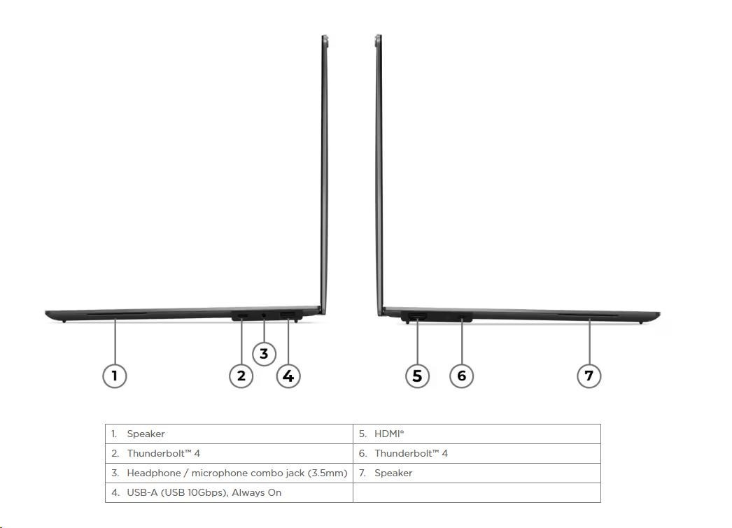 | Standartné porty | 1x USB-A (USB 10Gbps / USB 3.2 Gen 2), Always On 2x USB-C® (Thunderbolt™ 4 / USB4® 40Gbps), with USB PD 3.0 and DisplayPort™ 2.1 1x HDMI® 2.1, up to 4K/60Hz 1x Headphone / microphone combo jack (3.5mm) |