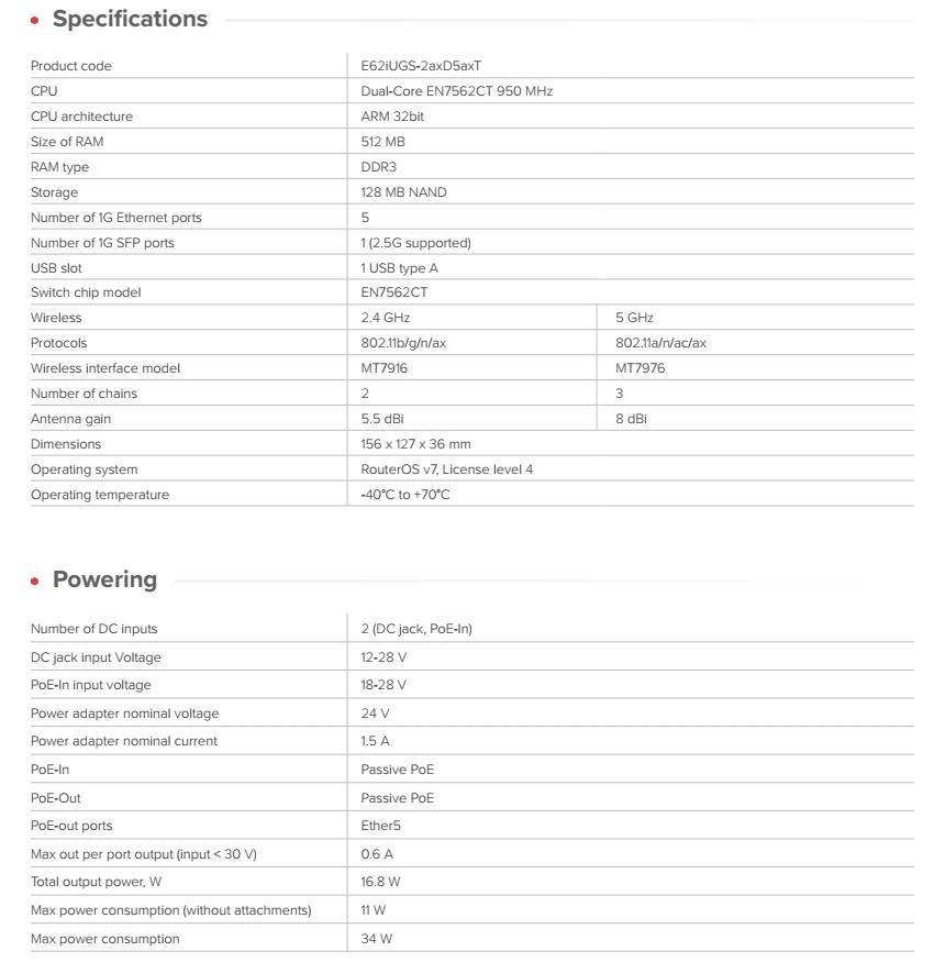 hAP ax S – nejvýhodnějším přístupový bod Mikrotiku s Wi-Fi 6. Levnější než většina sériově vyráběných wifirouterů střední třídy a přitom nabízí mnohem větší flexibilitu. Pod elegantním vnějším pláštěm se skrývá dvoujádrový procesor ARM, dvoupásmové Wi-Fi 6, USB, pět gigabitových ethernetových portů a 2,5 gigabitová SFP šachta. Můžete se připojit přímo k optickému kabelu nebo propojit vysokorychlostní NAS pro bleskurychlý místní přístup. Triple-chain 5GHz: klíč ke stabilnímu Wi-Fi v gigabitové třídě Nový hAP ax S je vybaven triple-chain 5GHz rádiem, které dosahuje reálné propustnosti kolem 800–900 Mbit/s. To znamená plynulé streamování, rychlejší stahování a stabilní výkon na více zařízeních. Je také ideální jako specializovaný přístupový bod Wi-Fi 6 VR pro streamování pro PC VR headsety, který nabízí vyšší rozlišení a nižší latenci bez kabelů. Na rozdíl od jednoúčelových „herních“ přístupových bodů vám hAP ax S nabízí plný výkon, flexibilitu a funkční budoucnost v stále zdokonalovaném RouterOS v7. Flexibilní napájení AP skýtá dvě možnosti napájení – přes DC konektor nebo PoE-in – dále integrován pasivní port PoE-out. PoE-out port využijete pro napájení dalšího zařízení MikroTik, jako je například další AP nebo kompaktní stolní switch. Vaše síť, Vaše pravidla Navzdory nízké ceně běží hAP ax S na plné verzi RouterOS v7, nejflexibilnějším síťovém softwaru na trhu. V době rostoucích výzev v oblasti zabezpečení dat a ochrany soukromí vám RouterOS poskytuje úplnou kontrolu – bez předplatného, bez upsellů, bez uzamčených funkcí. Ať už konfigurujete svou první Wi-Fi síť prostřednictvím aplikace MikroTik nebo budujete složité topologie, RouterOS v7 roste s vámi. VLAN, firewally, VPN tunely, tvarování provozu, skriptování, automatizace SMS – možnosti jsou neomezené. Například: můžete snadno izolovat zařízení IoT do samostatných podsítí, abyste ochránili svou domácí síť před nechtěným přístupem přes smart spotřebiče. Dodáváno s napájecím adaptérem 24V 1.5A v produktovém balení. Technické specifikace: Product code: E62iUGS-2axD5axT CPU: Dual-Core EN7562CT 950 MHz CPU architecture: ARM 32bit Size of RAM: 512 MB RAM type: DDR3 Storage: 128 MB NAND Number of 1G Ethernet ports: 5 Number of 1G SFP ports: 1 (2.5G supported) USB slot: 1 USB type A Switch chip model: EN7562CT Wireless: 2.4 GHz, 5 GHz Protocols: 802.11b/g/n/ax, 802.11a/n/ac/ax Wireless interface model: MT7916 MT7976 Number of chains: 2,4GHz - 2, 5GHz - 3 Antenna gain: 2,4GHz - 5.5dBi, 5GHz - 8dBi Dimensions: 156 x 127 x 36 mm Operating system: RouterOS v7, License level 4 Operating temperature: -40°C to +70°C Napájení Number of DC inputs: 2 (DC jack, PoE-In) DC jack input Voltage: 12-28 V PoE-In input voltage: 18-28 V Power adapter nominal voltage: 24 V Power adapter nominal current: 1.5 A PoE-In: Passive PoE PoE-Out: Passive PoE PoE-out ports: Ether5 Max out per port output (input < 30 V): 0.6 A Total output power: 16.8 W Max power consumption (without attachments): 11 W Max power consumption: 34 W Upozornění: Výrobce Mikrotik neposkytuje záruku na zařízení poškozená přepětím. Zařízení je třeba adekvátně chránit proti indukovanému elektrostatickému přepětí či přepěťovým špičkám na silovém vedení. Pro venkovní instalace používat výhradně stíněnou kabeláž (FTP/SFTP) a jednotky korektně uzemnit (prostřednictvím integrovaného zemnícího členu či použitím ethernetové přepěťové ochrany). Zařízení vždy provozujte s poslední výrobcem publikovanou verzí (výrobcem označenou "Stable") operačního systému RouterOS. Taková verze garantuje nejoptimálnější funčknost, obsahuje opravené chyby z verzí předchozích a výkonová vylepšení..