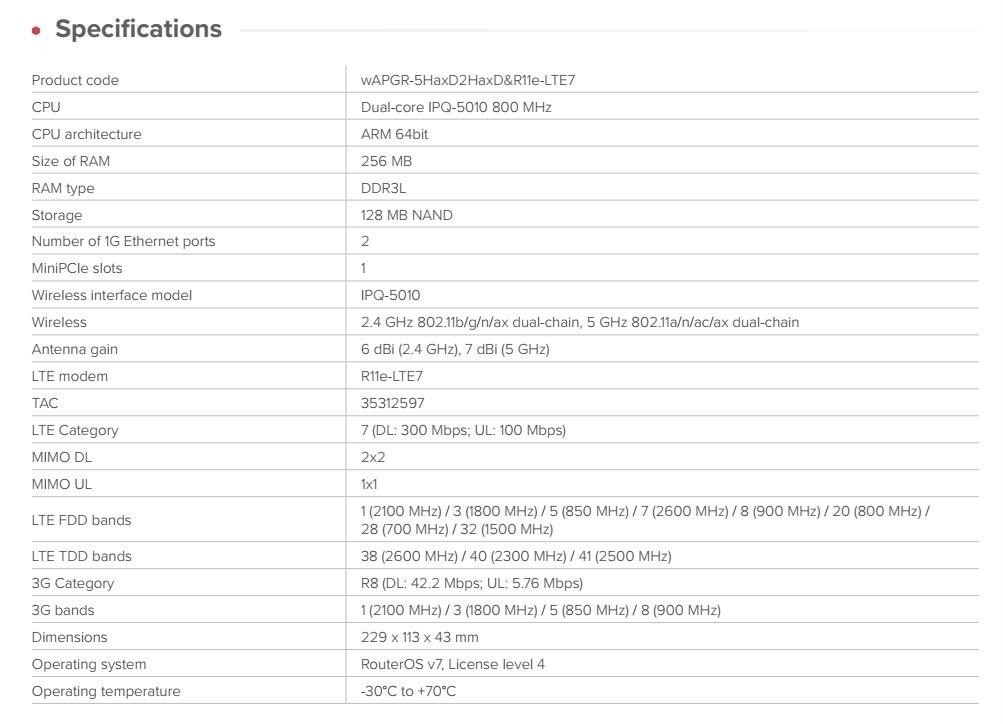 Sada wAP ax LTE7 přináší rychlé a spolehlivé Wi-Fi 6 do vaší venkovské chaty nebo jakéhokoli jiného náročného prostředí – například venkovské čerpací stanice nebo autobusové zastávky. Odolný design wAP díky své jednoduchosti a odolnosti zůstává oblíbeným produktem mezi uživateli MikroTik. Aktualizovaný kryt ještě více zvyšuje odolnost a pro větší bezpečnost je vybaven skrytým antivandalským šroubem za logem MikroTik. Nyní přichází vylepšen o modem CAT7 LTE s dvojnásobnou rychlostí nahrávání a výkonnější platformu ARM. Výkonné dvoupásmové rádio s duálním řetězcem (2x2 MIMO) zajišťuje silné bezdrátové pokrytí v celém vašem domě, na zahradě nebo v obchodních prostorách. Integrované antény s vyšším ziskem a přepracovaným systémem LTE pro ještě lepší kvalitu signálu, vyšší dosah a lepší stabilitu v náročných prostředích. Proč upgradovat na CAT7? • Dvojnásobná rychlost nahrávání (v závislosti na infrastruktuře LTE vysílačů a dalších proměnných) • Rozšířená podpora frekvencí, včetně pásma 28 (700 MHz) a pásma 32 (1500 MHz) pro lepší výkon v exponovaných oblastech • Agregace nosných (2×CA) pro vyšší účinnost a odezvu v rušných sítích • Stejný osvědčený design – žádné změny v instalaci nebo konfiguraci • Nižší náklady – lepší konektivita Vylepšený hardware s jednoduchou správou Tento kompaktní přístupový bod je vybaven moderním dvoujádrovým procesorem ARM a běží na systému RouterOS v7, což zajišťuje stabilní připojení k internetu a vynikající výkon VPN. wAP ax LTE7 kit také podporuje nový systém CAPsMAN pro snadnou centralizovanou správu více zařízení pouhými několika kliknutími. Zařízení je vybaveno dvěma gigabitovými ethernetovými porty, z nichž jeden má PoE-in pro flexibilní možnosti napájení. Lze také použít standardní DC konektor. Nenápadný design – odolný proti povětrnostním vlivům a vandalismu wAP ax LTE7 je navržena tak, aby zapadla do jakéhokoli prostředí. Její jednoduchý, elegantní design nepřitahuje nežádoucí pozornost, takže je ideální i pro rušná veřejná prostranství. wAP lze bezpečně připevnit k jakékoli vnější stěně nebo střeše zevnitř pouzdra. Vyznačené prohlubně na zadní straně krytu označují místo pro vrtání otvoru pro průchod kabelu, což umožňuje diskrétní a bezpečné montáž na stěnu. Technické specifikace: Product code: wAPGR-5HaxD2HaxD&R11e-LTE7 CPU: Dual-core IPQ-5010 800 MHz CPU architecture: ARM 64bit Size of RAM: 256 MB RAM type: DDR3L Storage 128 MB NAND Number of 1G Ethernet ports: 2 MiniPCIe slots: 1 Wireless interface model: IPQ-5010 Wireless: 2.4 GHz 802.11b/g/n/ax dual-chain, 5 GHz 802.11a/n/ac/ax dual-chain Antenna gain: 6 dBi (2.4 GHz), 7 dBi (5 GHz) LTE modem: R11e-LTE7 TAC: 35312597 LTE Category: 7 (DL: 300 Mbps; UL: 100 Mbps) MIMO DL: 2x2 MIMO UL: 1x1 LTE FDD bands: 1 (2100 MHz) / 3 (1800 MHz) / 5 (850 MHz) / 7 (2600 MHz) / 8 (900 MHz) / 20 (800 MHz) / 28 (700 MHz) / 32 (1500 MHz) LTE TDD bands: 38 (2600 MHz) / 40 (2300 MHz) / 41 (2500 MHz) 3G Category: R8 (DL: 42.2 Mbps; UL: 5.76 Mbps) 3G bands: 1 (2100 MHz) / 3 (1800 MHz) / 5 (850 MHz) / 8 (900 MHz) Dimensions: 229 x 113 x 43 mm Operating system: RouterOS v7, License level 4 Operating temperature: -30°C to +70°C Napájení: Number of DC inputs: 2 (DC-jack, PoE-In) DC-jack input Voltage: 12-57 V PoE-In input Voltage: 18-57 V Power adapter nominal voltage: 24 V Power adapter nominal current: 0.8 A PoE-in: 802.3af/at Max power consumption: 13 W .