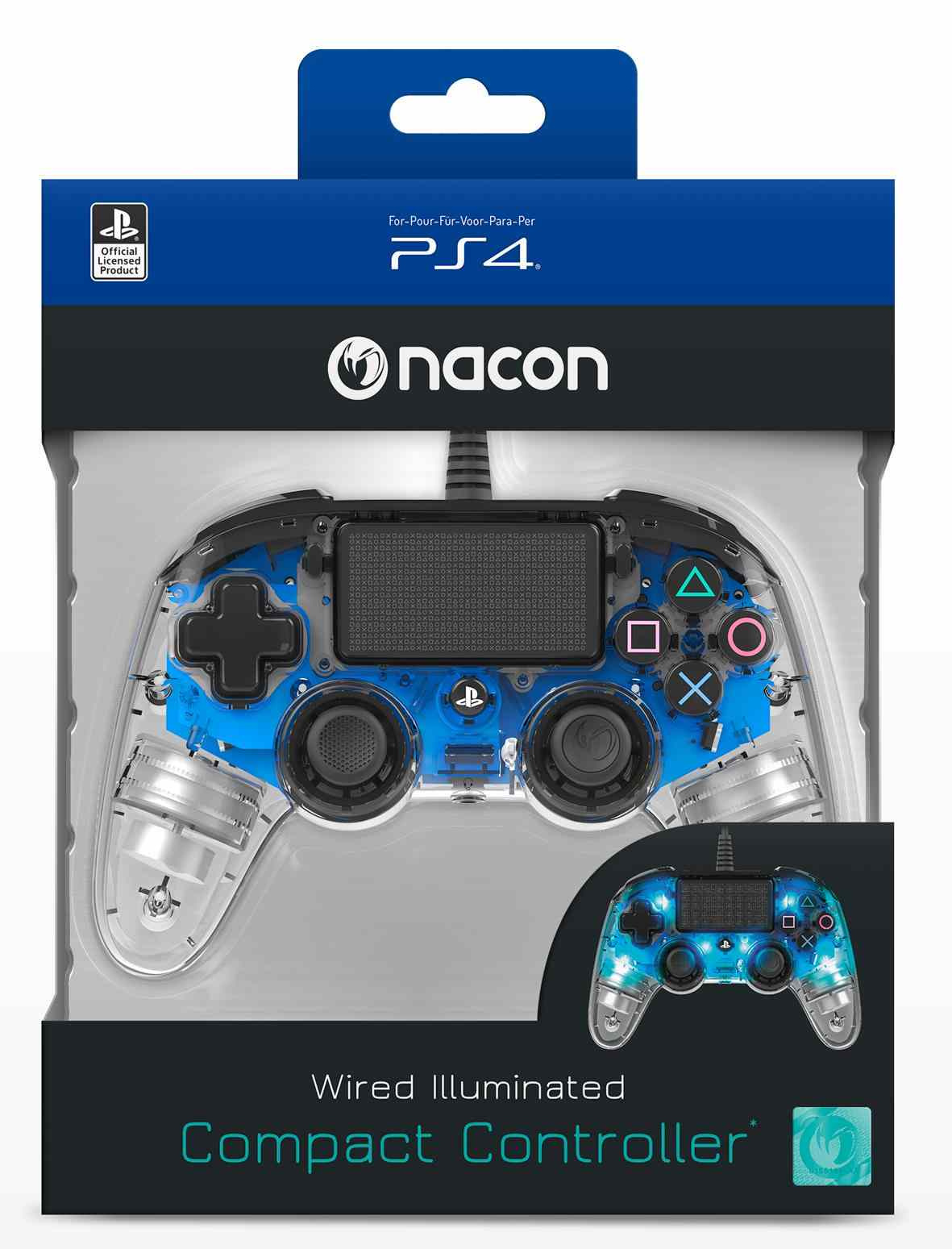 Káblový podsvietený kompaktný ovládač od spoločnosti Nacon ponúka pôsobivé množstvo funkcií, ako je dotykový panel, konektor pre slúchadlá s mikrofónom alebo dvojica vibračných motorov. Vďaka ergonomickému dizajnu sa ovládač pohodlne drží pre hráčov všetkých vekových kategórií, a to aj počas hodín hrania. V prípade podsvieteného modelu s plne priehľadným povrchom