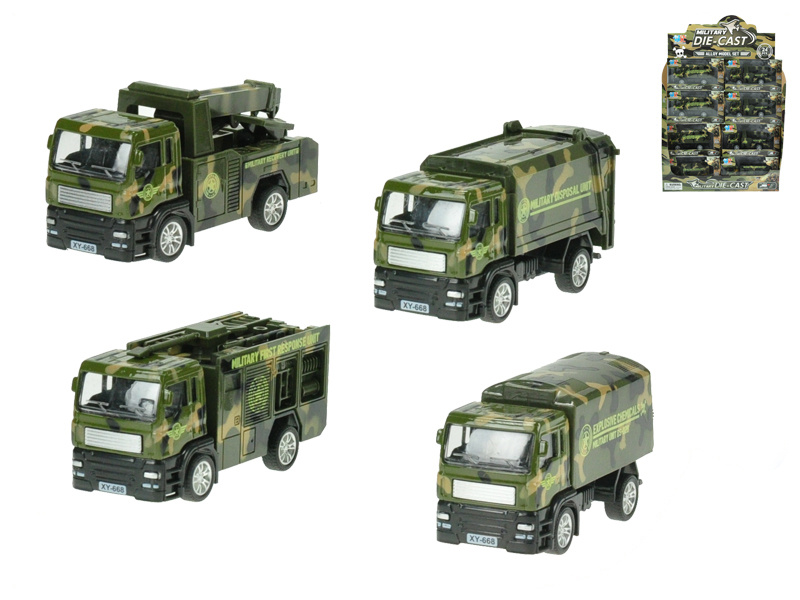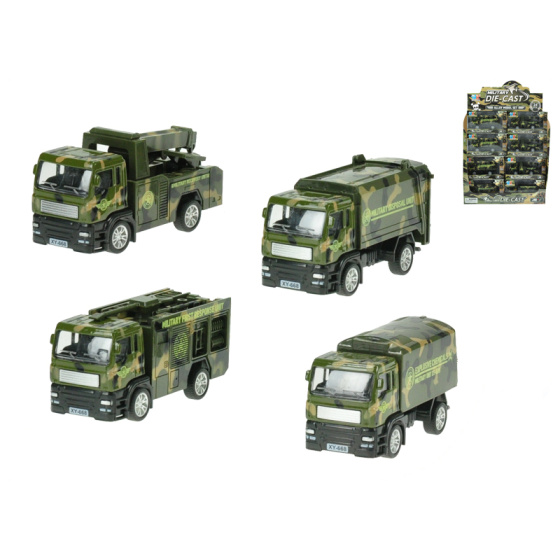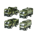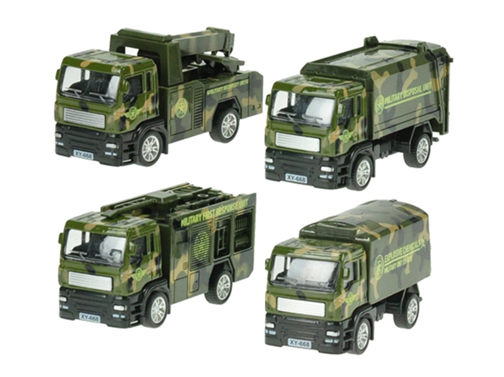 Vojenské auto o veľkosti 12cm z kovu. Štyri rôzne druhy - auto nákladné, auto so žeriavom, auto vezúce chemikálie alebo auto záchranárske. Všetky deti, ktoré milujú vojačikov určite ocenia aj tento skvelý kúsok.