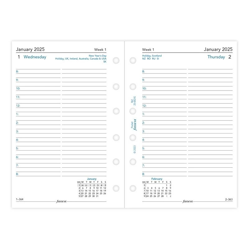Anglický kalendár 2025 deň na 1 stránku pre diára Filofax o veľkosti Pocket - vreckový. Sobota a nedeľa sú na 1 strane.