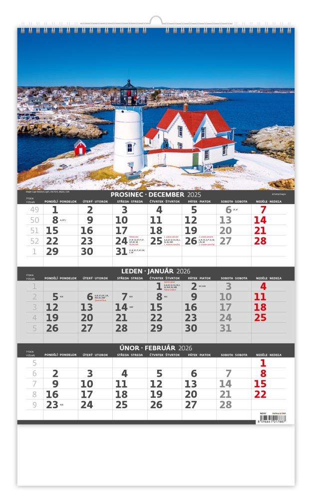 Formát kalendára: 31,5 x 45 cm • Kalendárium: české/slovenské trojmesačné so sviatkami európskych štátov (CZ / SK / A / B / D / F / H / CH / I / PL / RUS / UKR) • Rozsah kalendára: 12 listov • Priestor na potlač: 31,5 x 7 cm