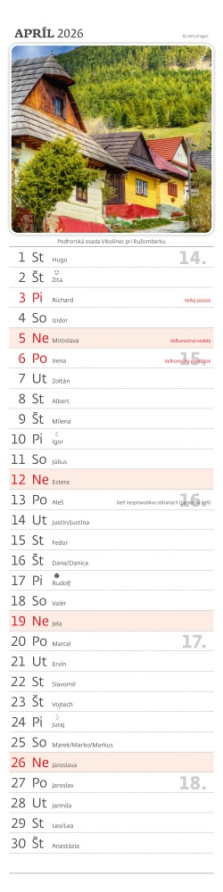 Formát kalendára: 12 x 48 cm• Kalendárium: slovenské mesačné menné• Rozsah kalendára: 13 listov• Väz