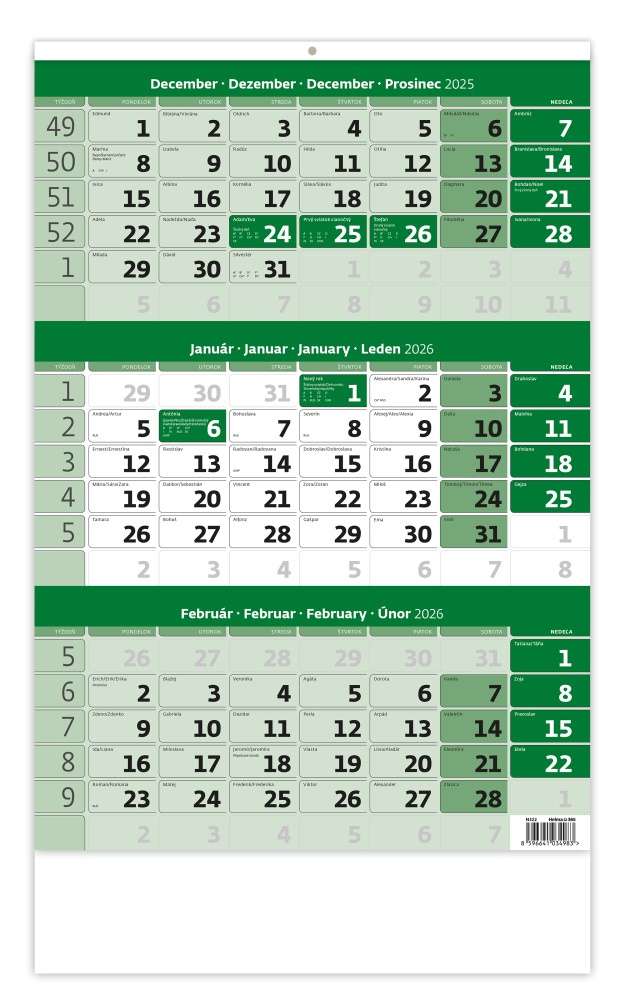Popis Nástenný kalendár 2026 - trojmesačný zelený s menným kalendáriom