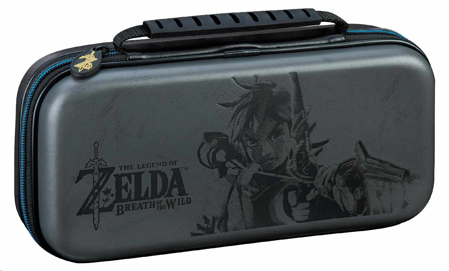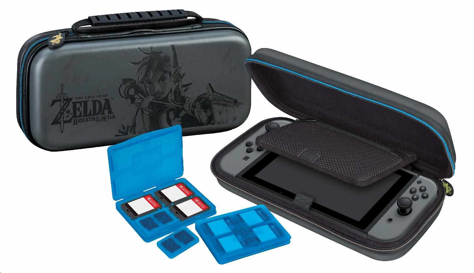 V tomto luxusnom cestovnom kufríku s témou akčnej adventúry Legend of Zelda™: Breath of the Wild môžete bezpečne a bezpečne prepraviť svoju obľúbenú hernú konzolu Nintendo Switch™. Polstrovaná prepážka v strede puzdra chráni obrazovku konzoly pred poškriabaním a sieťované vrecko na zips na druhej strane môže ukladať karty s inými hrami.