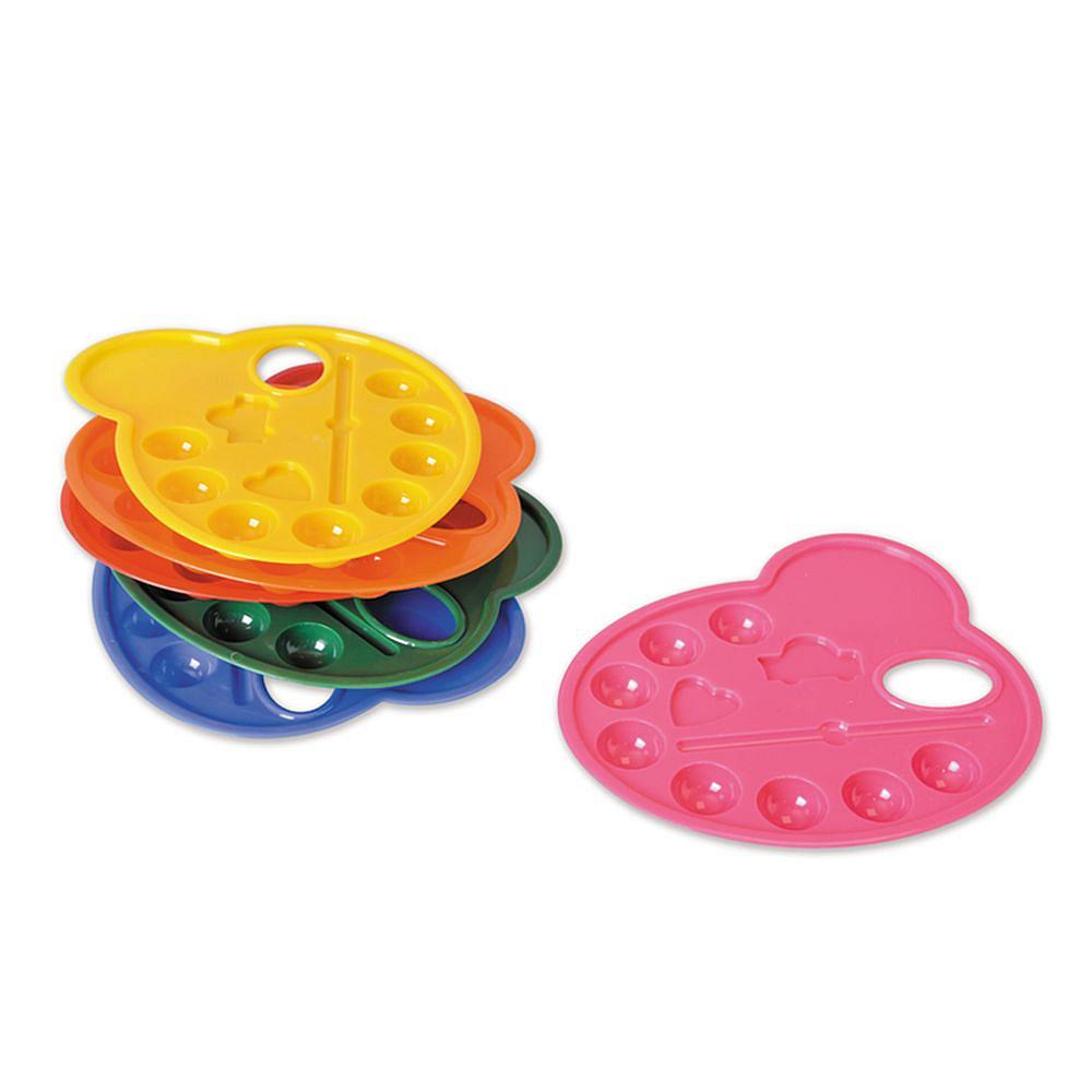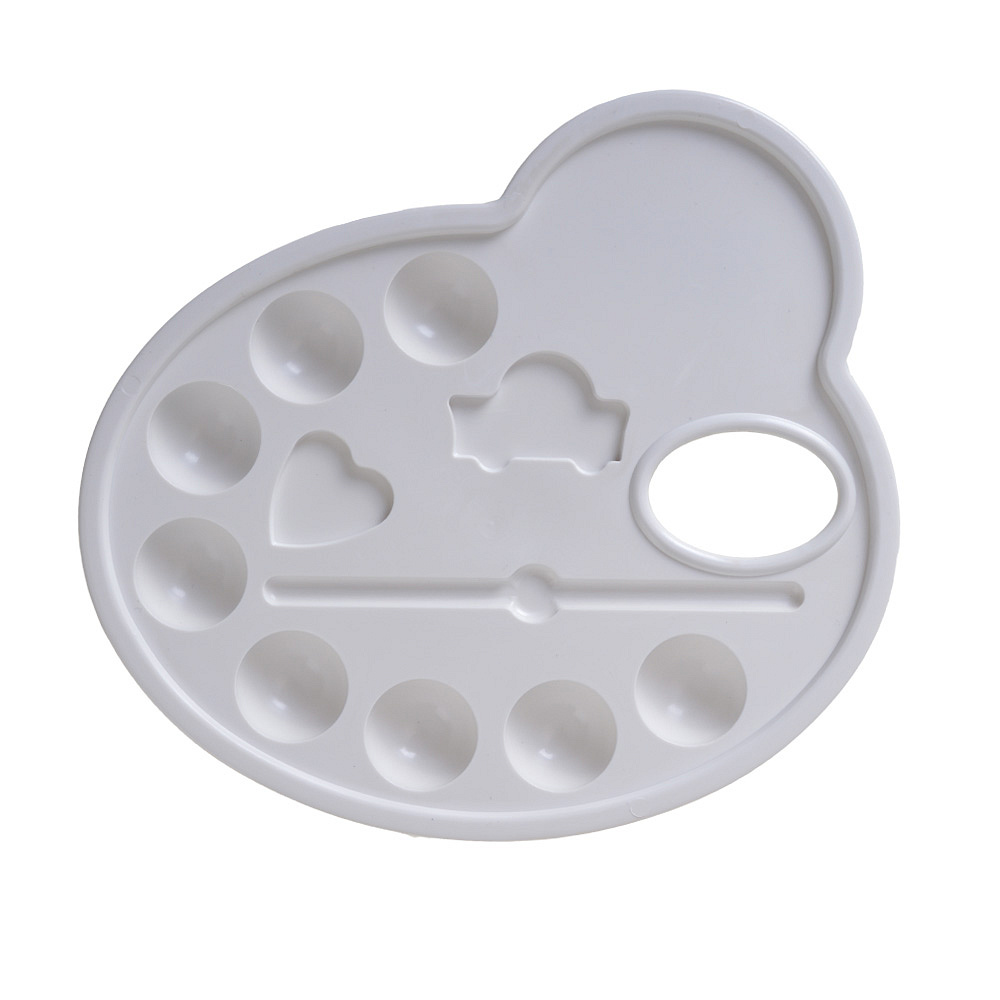 Paletka z pevného plastu s 8 jamkami na farby, 2 priehradkami na miešanie farieb a priehradkou na odkladanie štetcov.