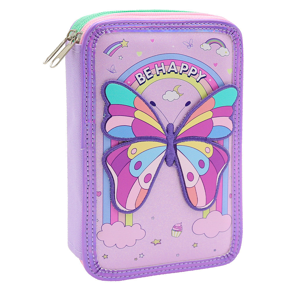 Fialové lemovanie hrajúc dúhovými farbami + gumová nášivka Motýľa.