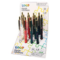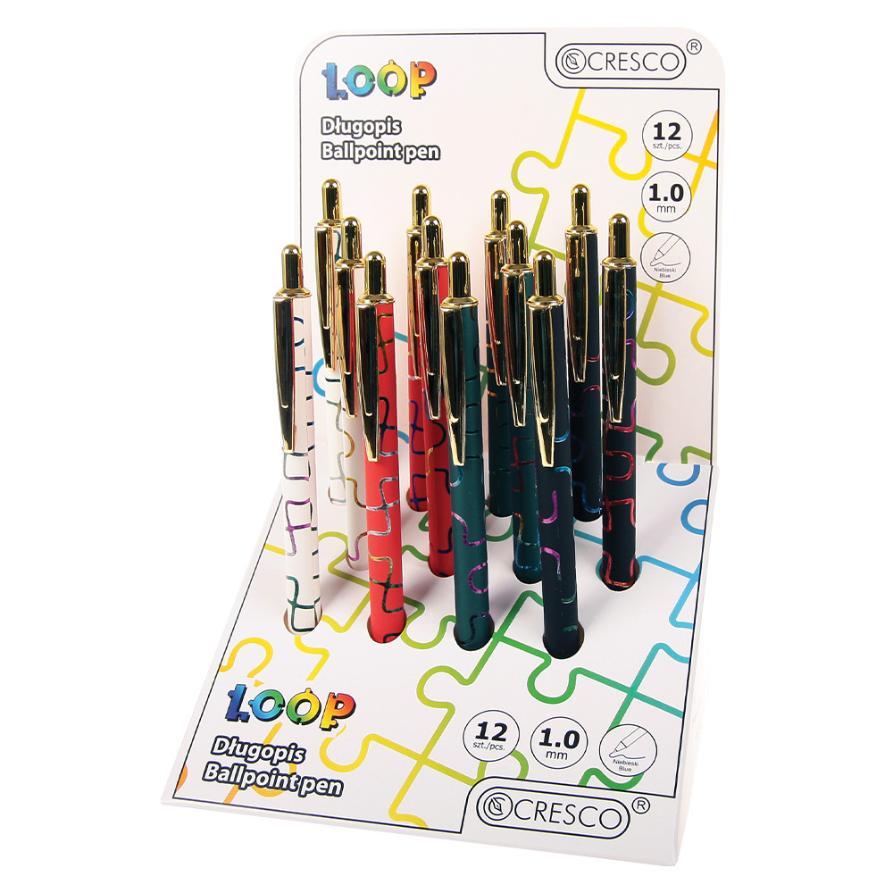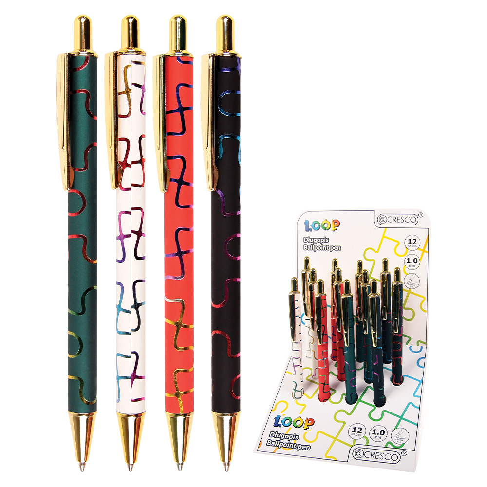 Guľôčkové pero s telom príjemného na dotyk a nekonečným dúhovým vzorom. Lesklé chrómované doplnky v zlatej farbe.