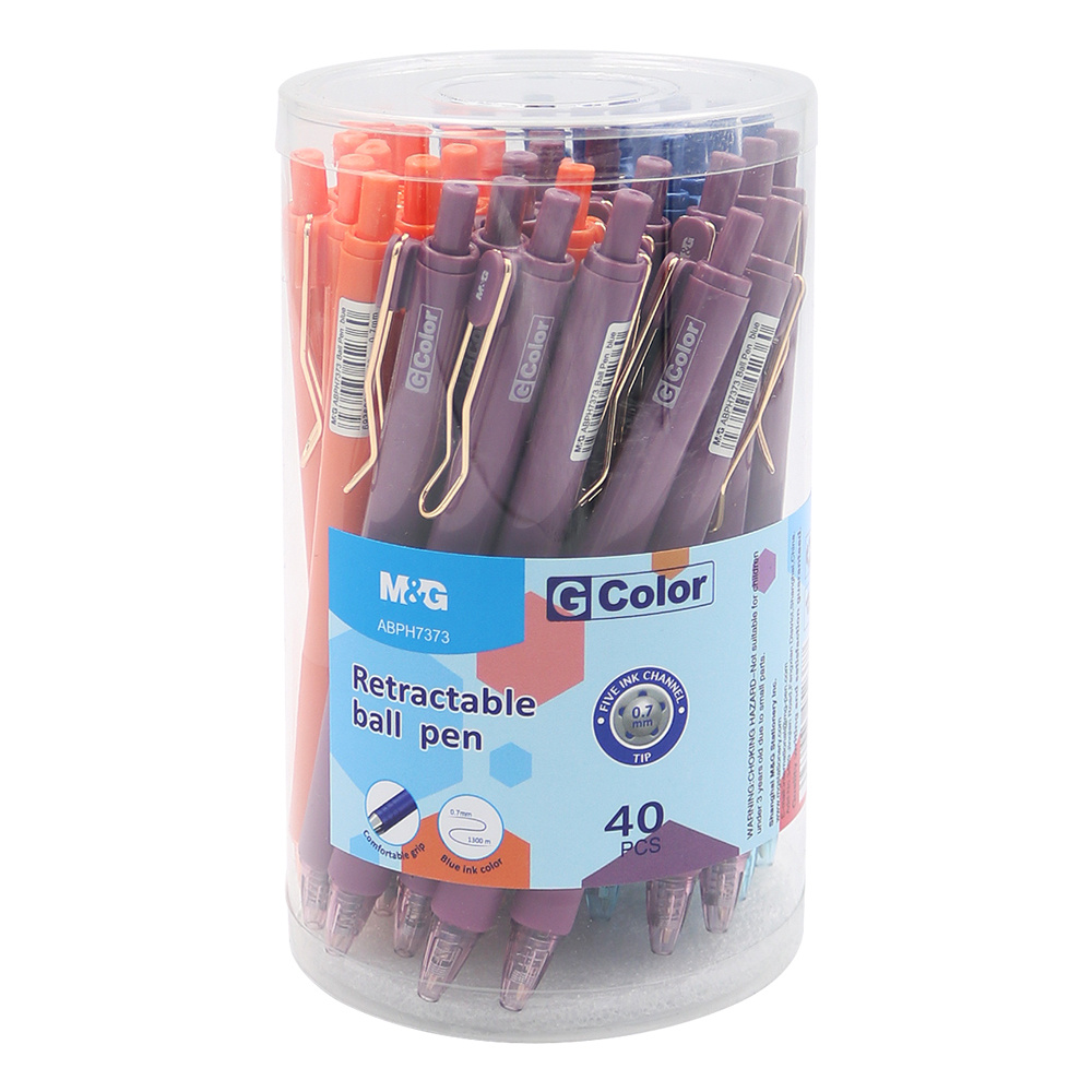 Guľôčkové pero s plastovým, okrúhlym telom a kovovou sponou.