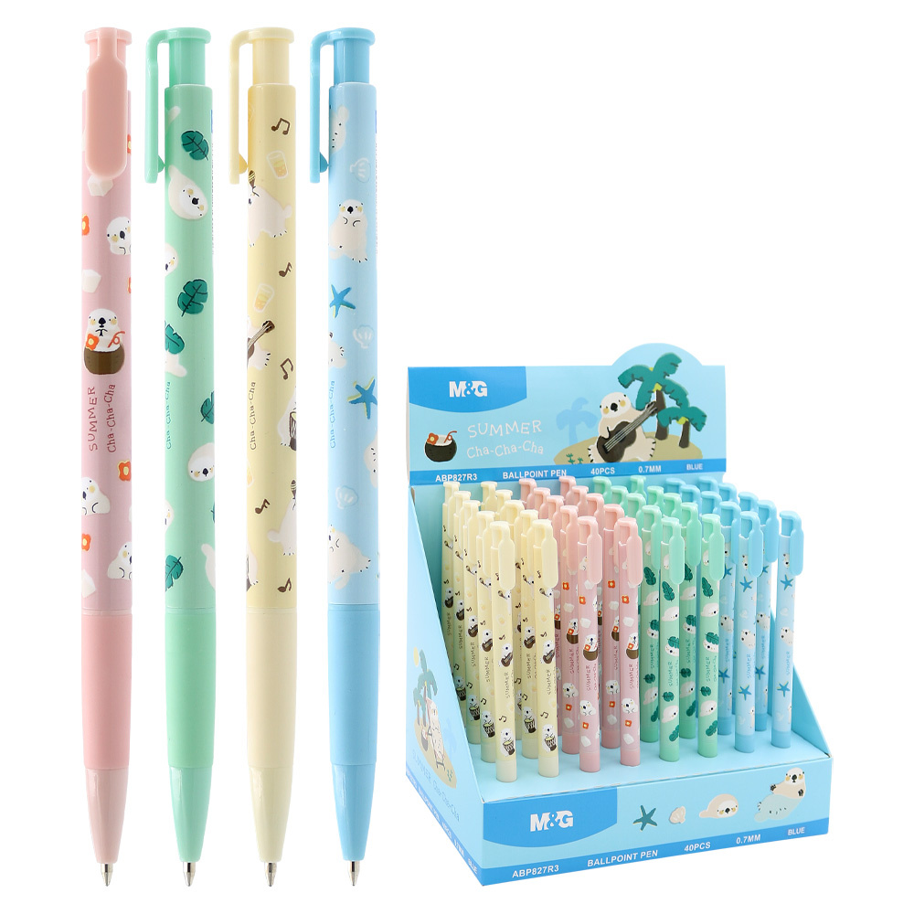 Guľôčkové pero s detským motívom v pastelových farbách: žltej, ružovej, zelenej a modrej.