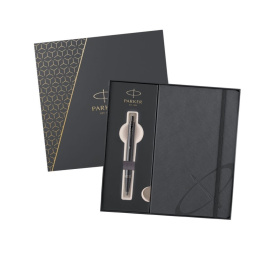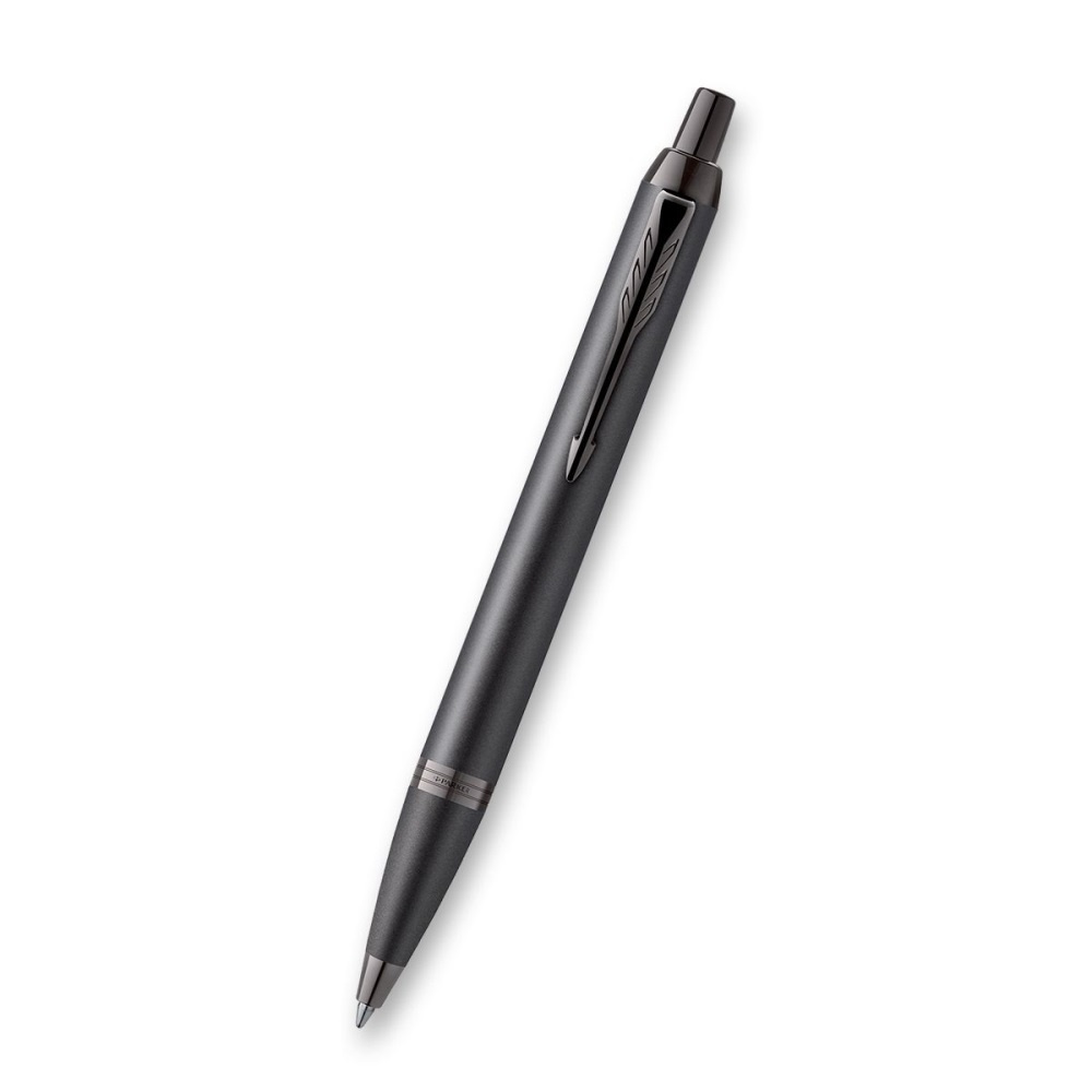 Súprava obsahuje čierne PU puzdro a guličkové pero Parker IM Titanium Monochrome s mosadzným telom pokrytým matným tmavým lakom v kombinácii s doplnkami potiahnutými pomocou techniky PVD odolnou lesklou tmavou farbou.