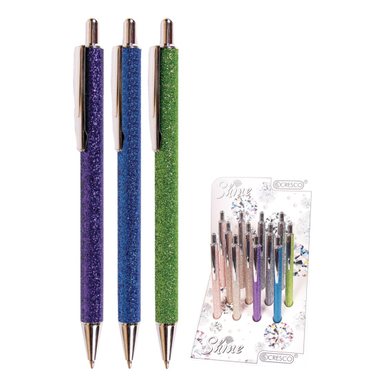Guľôčkové pero s plastovým telom v jasných perleťových farbách fialová, zelená, modrá a kovovými doplnkami.