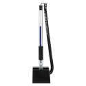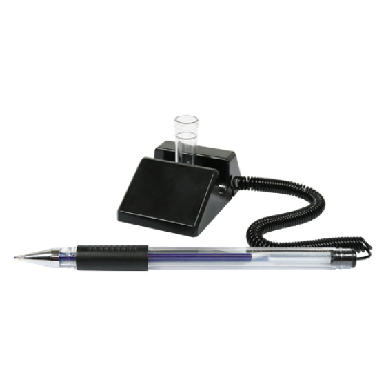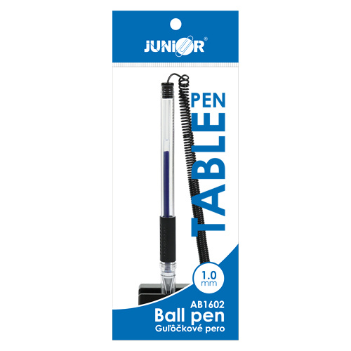 Guľôčkové pero na pružinke s praktickým plastovým stojančekom, ideálne pre kancelárie a úrady.