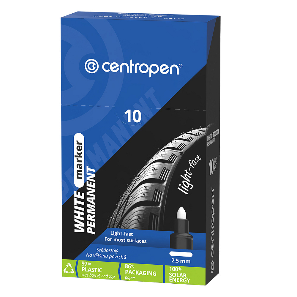 Univerzálny permanentný značkovač, určený pre hobby a priemysel. Biely atrament na vodnej báze, píše na povrchy väčšiny materiálov. Po dokonalom zaschnutí /cca 3 hodiny/ stopa odoláva vode a oteru. Valcový hrot, šírka stopy 2,5 mm. Skladovať vo vodorovnej polohe.