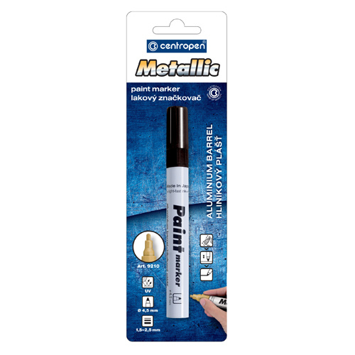 Univerzálny lakový popisovač CENTROPEN 9210. Hliníkový plášť s prepúšťacím mechanizmom. Píše na porézne aj neporézne povrchy. Svetlostály, po zaschnutí odolá vode, oteru, poveternostným vplyvom. Valcový hrot, šírka stopy 1,5 – 2,5 mm. Farba: čierna.