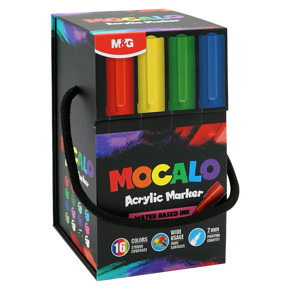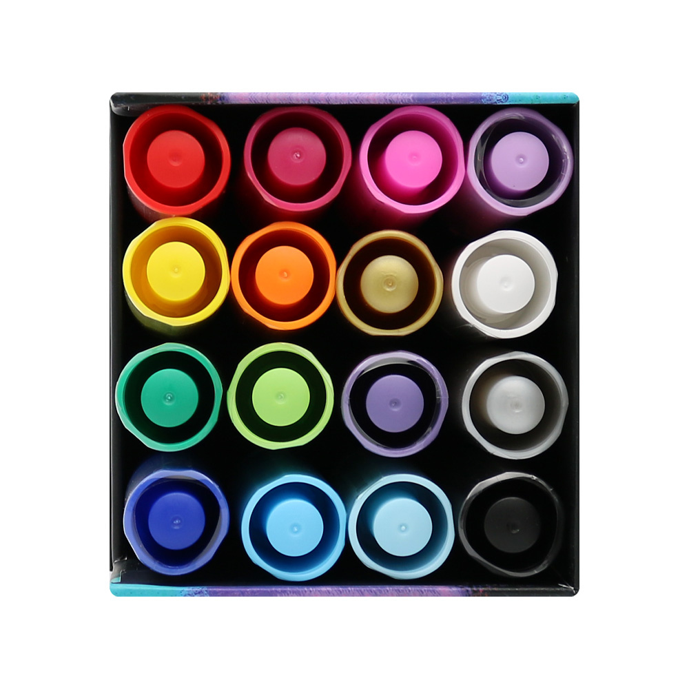 Sada obsahuje 16 akrylových farieb v kartónovom balení s praktickým otváraním na magnet a mäkkou šnúrkou na prenášanie.