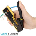 PremiumCord krimpovacie kliešte na priechodné RJ konektory sú spoľahlivým univerzálnym nástrojom na prácu s väčšinou bežných modulárnych zástrčiek radu RJ — vrátane RJ11, RJ12, RJ14, RJ45 a ďalších typov. Vďaka konštrukcii 3 v 1 umožňujú jednoduché krimpovanie, strihanie aj odizolovanie káblov, čo výrazne urýchľuje a upresňuje prácu pri výrobe či opravách sieťových a telefónnych vedení.
