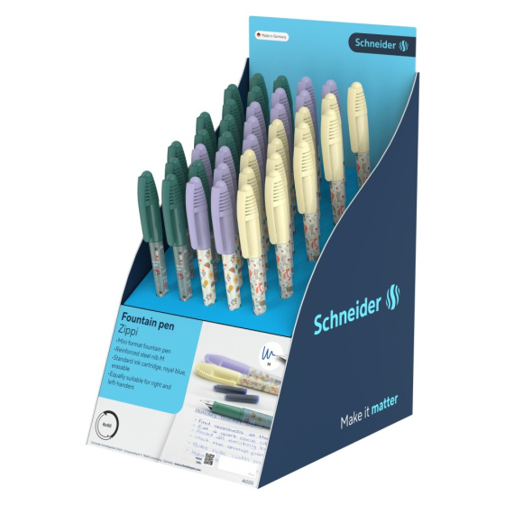 Plniace pero s klasickým hrotom na bombičku Schneider Zippi v predajnom displeji (13 × summertime,14 × wild pirates, 13 × fairytale forest.
