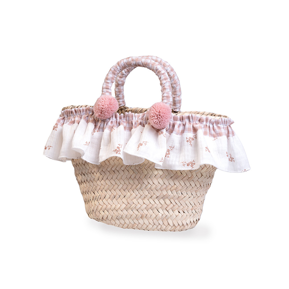 Užite si krásne prechádzky s palmovým košíkom /taškou s volánom a pompom.