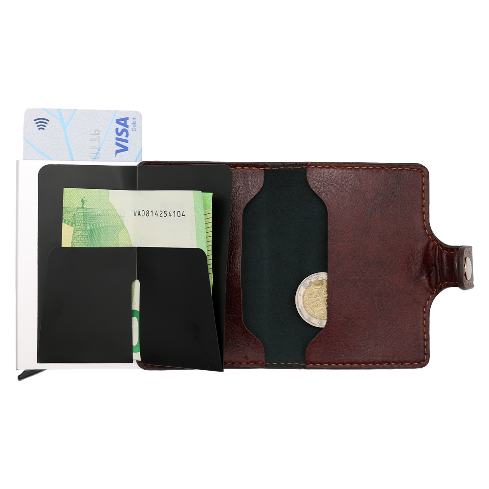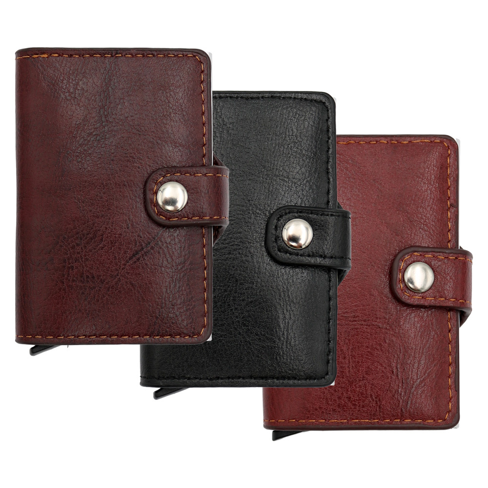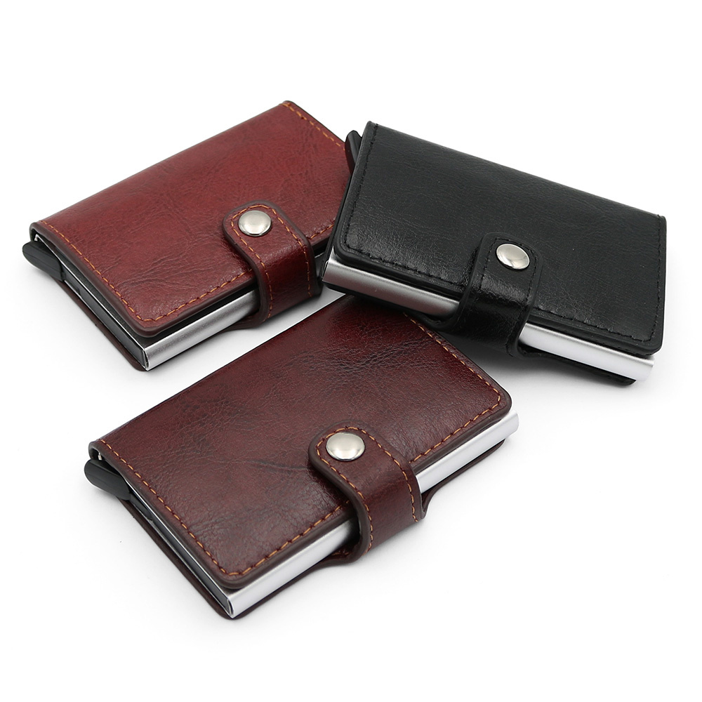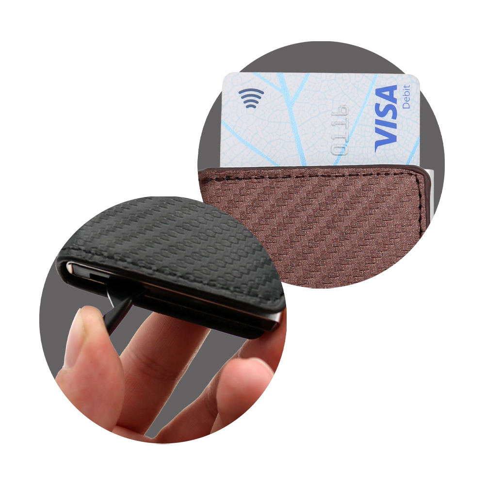 Puzdro na karty z PU, schránka z hliníkovej zliatiny s výsuvným mechanizmom.