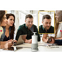 Thanks to its dual fisheye lens, the device can identify up to 8 individual speakers, and highlight the three most recent participants in high-resolution, larger frames. For larger meetings, two units can be connected together. Whilst acoustic echo cancellation and noise reduction ensure all participants can be heard clearly – even in places with background noise.