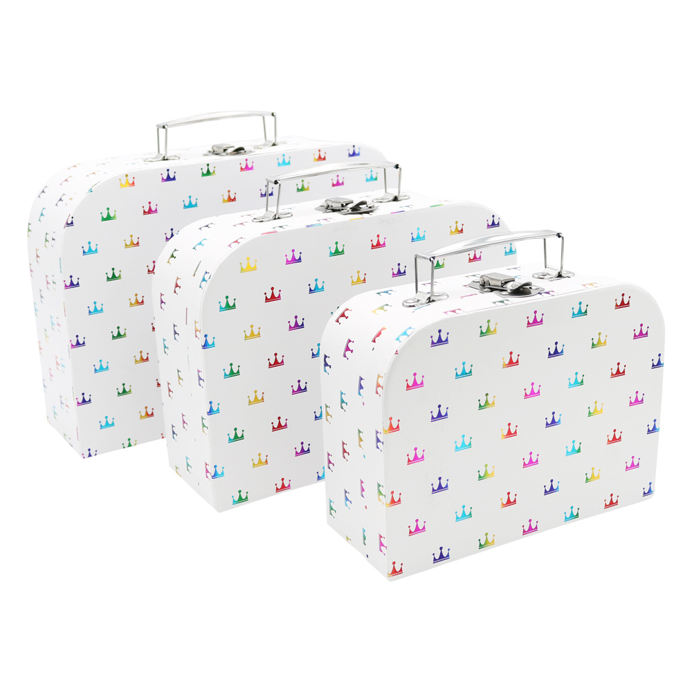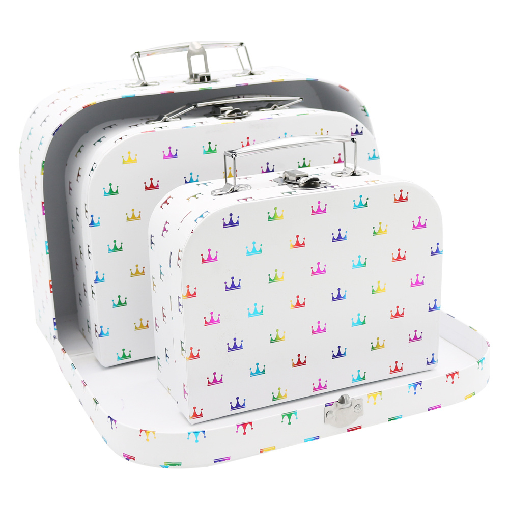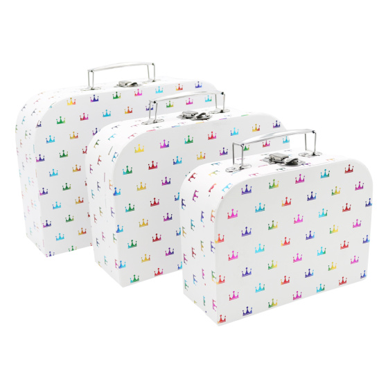 Sada troch detských kufríkov z pevného kartónu a kovovým kovaním (motív Korunky).