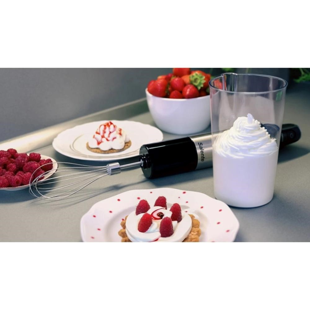 Salente Mixxo přichází do vaší kuchyně i s bohatým příslušenstvím: využívat můžete šlehací nástavec s nerezovou metličkou, mixovací nádobku o objemu 600 ml (s odměrnými ryskami po 100 ml) a taky sekáček s objemem 500 ml, který je vybaven nerezovými noži a silikonovou protiskluzovou podložkou. Pořízením tohoto všestranného mixéru zkrátka získáte kompletní vybavení, které posune vaše gastronomické kouzlení o úroveň výš.