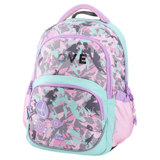 Ľahký školský batoh s anatomickým chrbtom, príveskom s gorálkami, nášivkou motýľa a dúhovým nápisom Love na prednej časti.